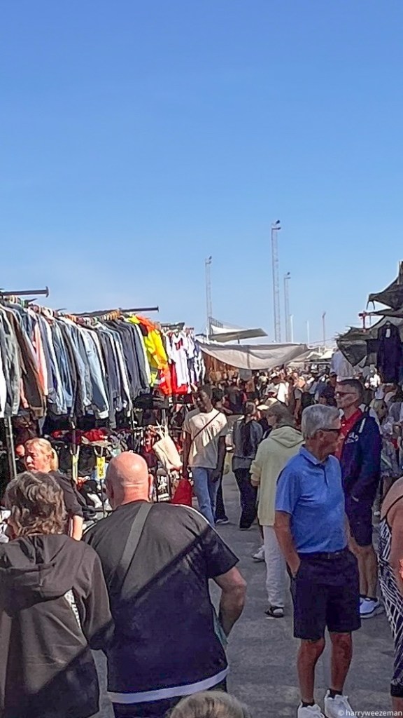 Torrevieja op volle kracht. Tussen de 800 en 1200 stuks. Kleuren, stemmen, geuren. Sinaasappels, kleding, spullen die je niet nodig hebt maar toch even oppakt.