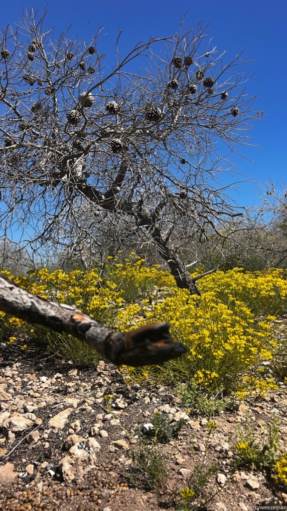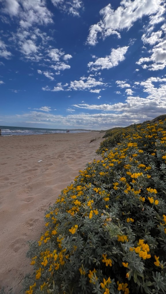 La Marina. Zee strak blauw. Duinen geel van de bloei. Het voorjaar staat hier niet op de kalender maar in het landschap. We parkeren, kijken, lopen een stukje en rijden weer door. Boodschappen moeten ook gebeuren. Lidl blijkt overal te zijn, zelfs hier.